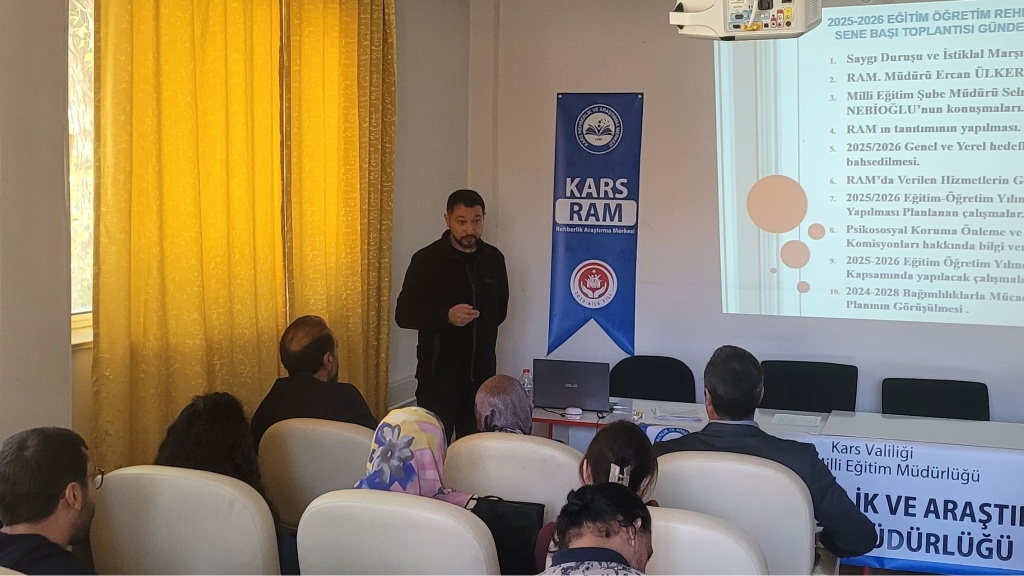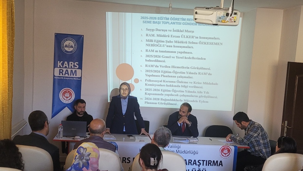 08/10/2025 Tarihinde Kars RAM toplantı salonunda İl Milli Eğitim Müdür Yardımcısı Sn. Selma ÖZKESEMEN NEBİOĞLU'nun da katılımı ile ilimiz bünyesinde görev yapan okul öncesi, ilkokul, BİLSEM ve özel eğitim okullarında görev yapan rehber öğretmenlerin yer aldığı (1. Grup) sene başı rehber öğretmen toplantılarının ilki gerçekleştirilmiştir.